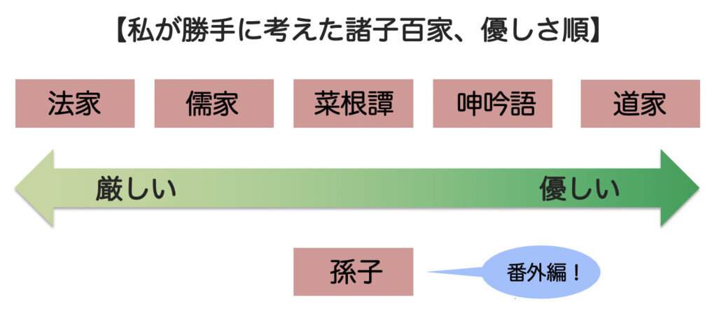 あれを作るにあたり、まず、諸子百家の中の代表的なものを優しさ順に並べてみました。