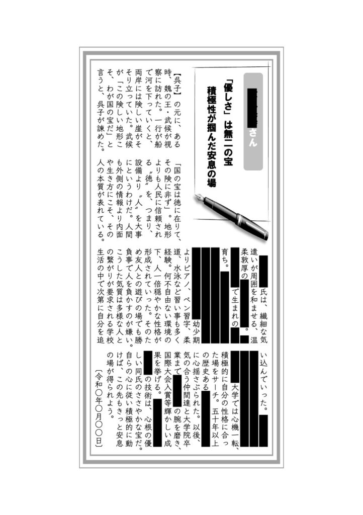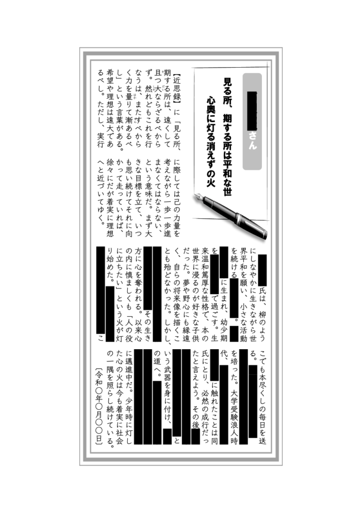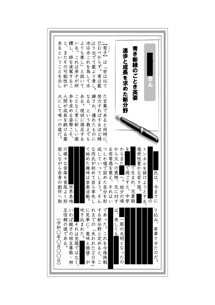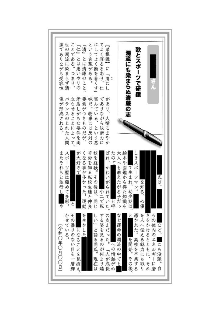 「媒体への掲載を前提としない」という本サービスの趣旨を踏み外さぬよう、お名前はもちろん、固有名詞を含む部分をブランクにしてありますが、“新聞コラム風”の雰囲気が伝われば幸いです。